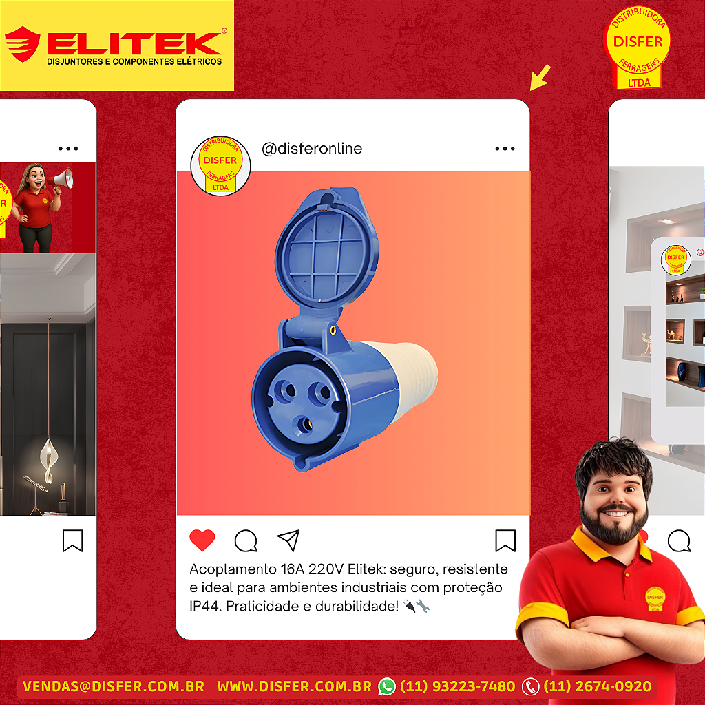 O Acoplamento Industrial Elitek modelo 1976 é ideal para aplicações que exigem confiabilidade elétrica e proteção contra respingos de água e poeira, com grau de proteção IP44. Com padrão 2P+T, ele opera em 220V e suporta até 16A, oferecendo praticidade e segurança em ambientes de uso intenso.