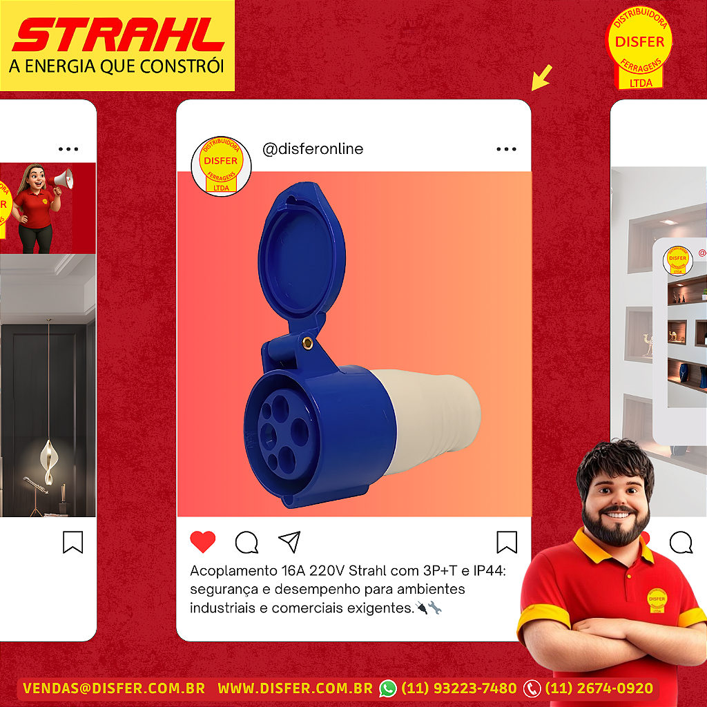 O Acoplamento Industrial Strahl modelo 4059/BC é ideal para conexões elétricas em ambientes que exigem resistência, praticidade e proteção contra respingos e poeira, graças ao seu grau de proteção IP44. Com padrão 3P+T, suporta corrente de até 16A em 220V, sendo perfeito para instalações industriais e comerciais robustas.