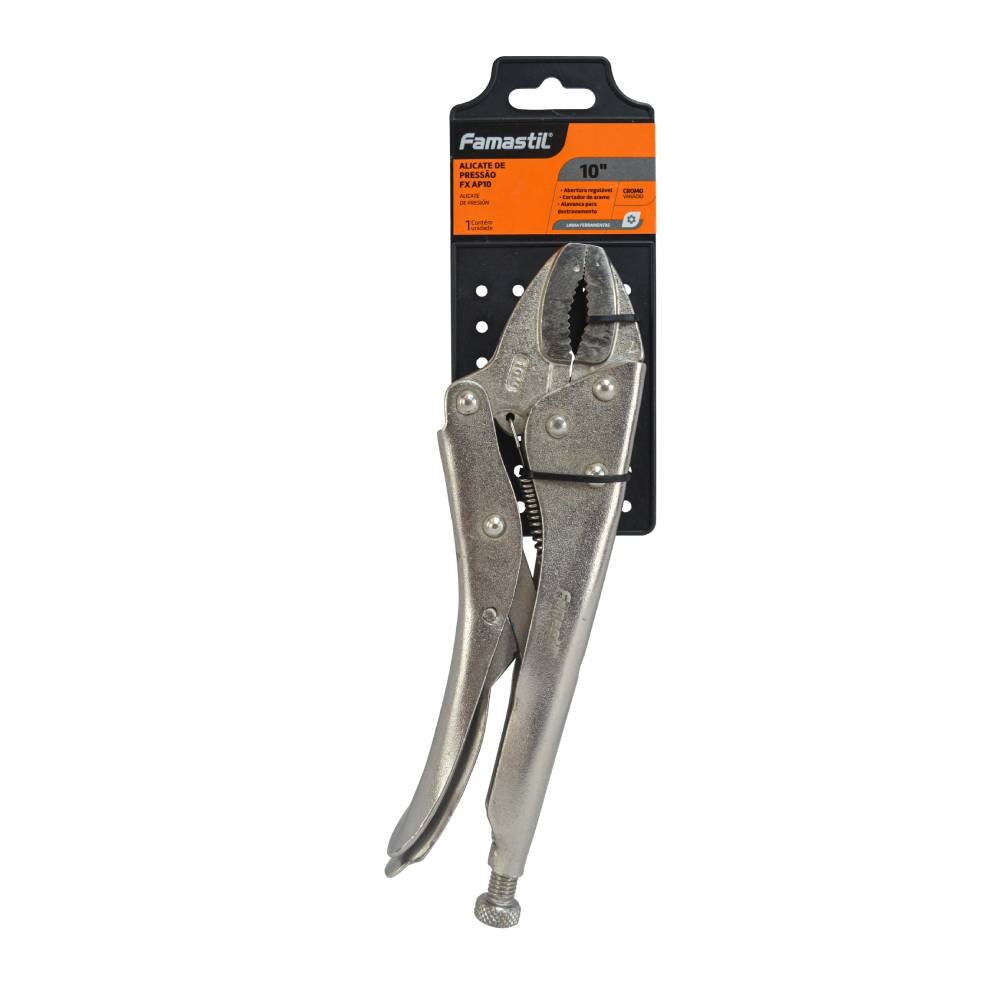 Para trabalhos que exigem mais força, conte com a resistência do Alicate de Pressão Famastil! Seu sistema de alavancas e material reforçado dão o suporte que você precisa na sua oficina. Produzido em aço com acabamento cromado, o Alicate de Pressão Famastil possui mordentes curvos e abertura regulável que permite prender e desapertar até mesmo parafusos com sextavado danificado. Esse modelo é muito versátil, também é utilizado para prensar, segurar e puxar firmemente peças com perfis variados, além de cortar arames de até 1/4.