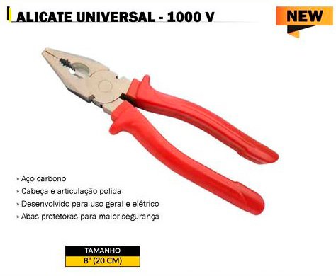 O alicate universal com isolação de 1000V, foi desenvolvido e é indicado para Serviços e Trabalhos com Eletricidade, em linhas energizadas, muito utilizado na manutenção eletroeletrônica, informática, predial e automotiva. Emborrachado e isolado com abas protetoras para as mãos, para dar mais segurança no seu manuseio.