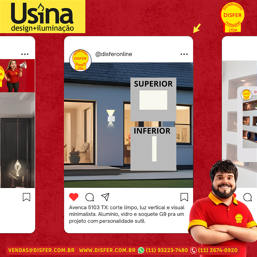 Conta com 1 corte superior e 1 lux inferior, criando uma iluminação vertical simples e elegante — para cima e para baixo, com equilíbrio e leveza. Ótima opção para iluminar discretamente sem roubar a cena.