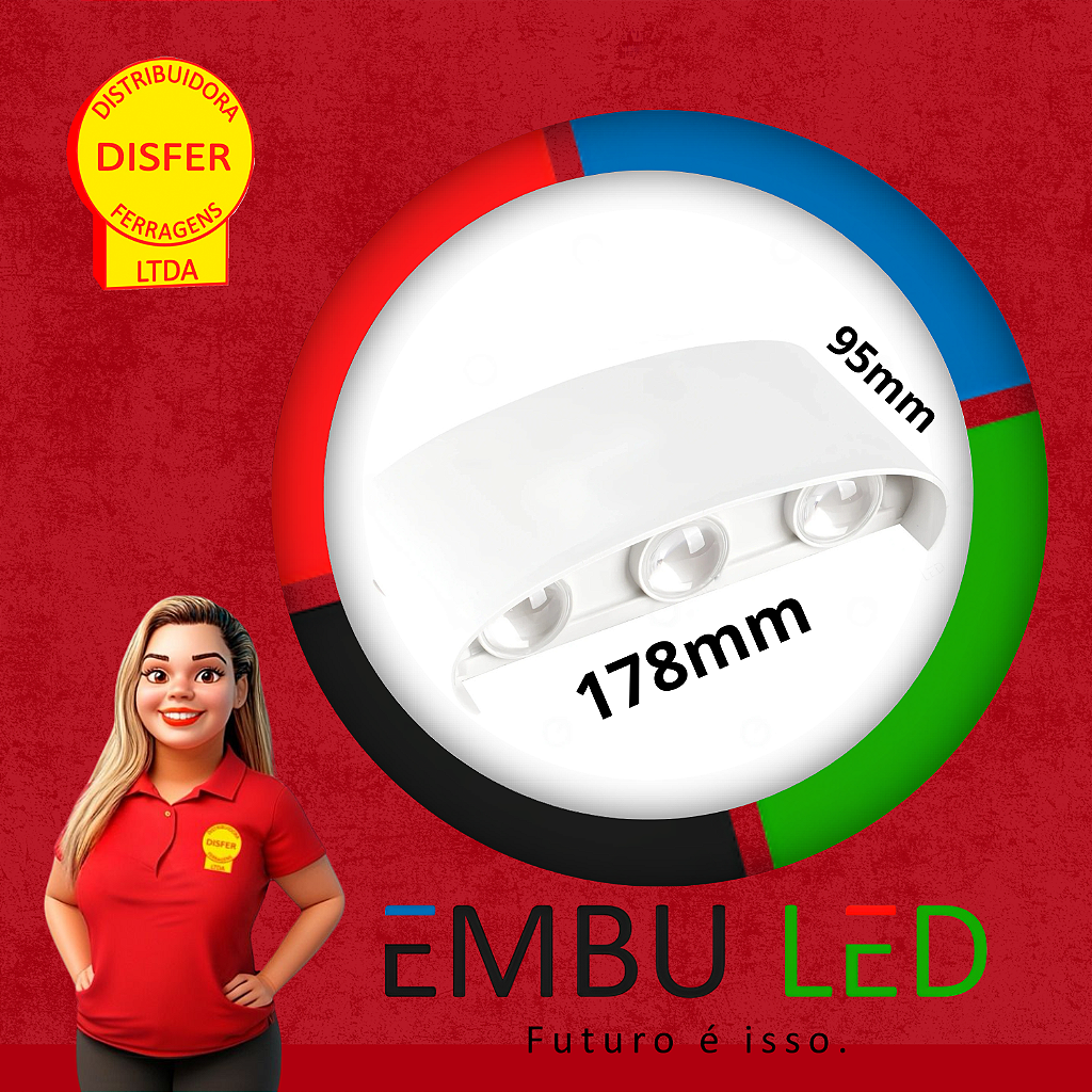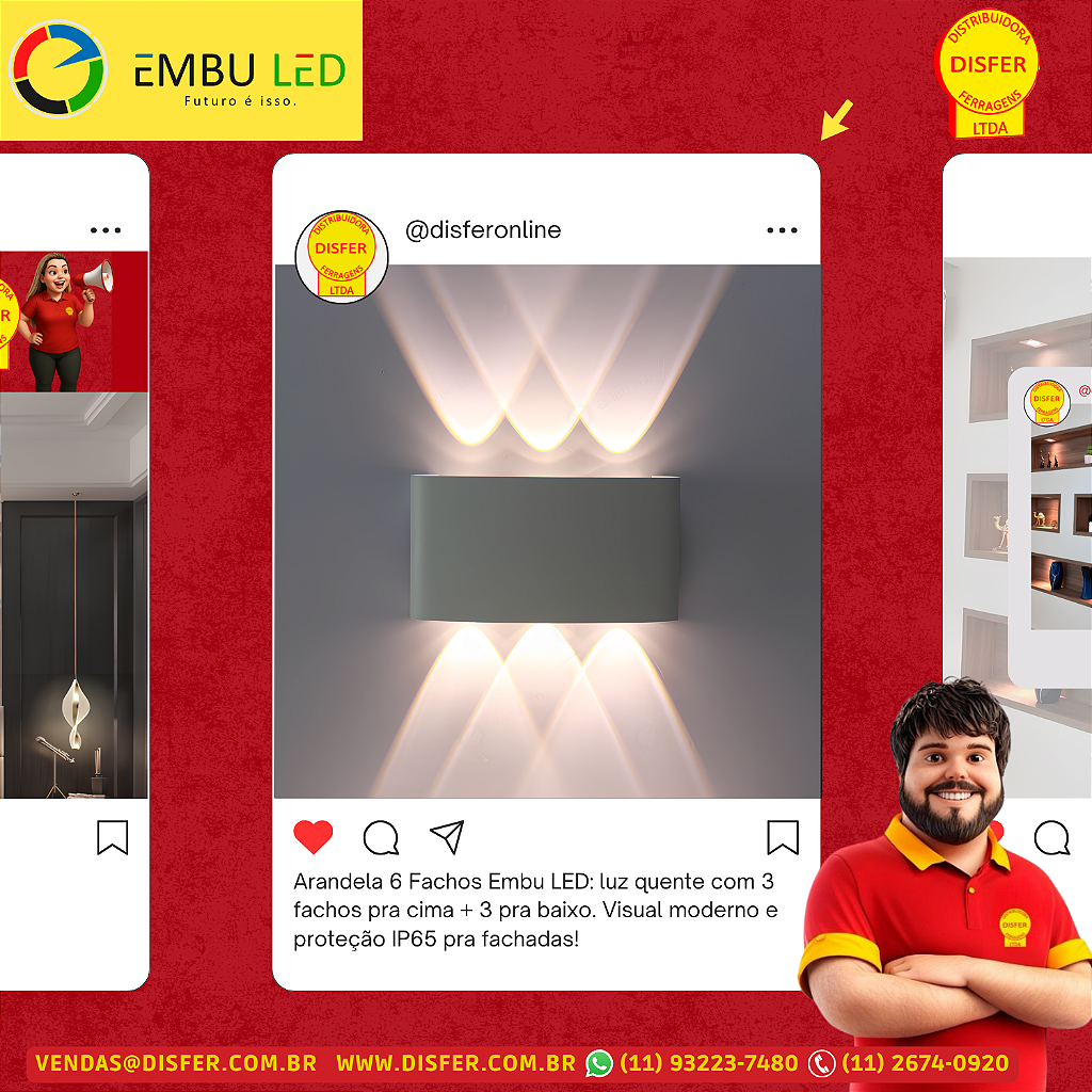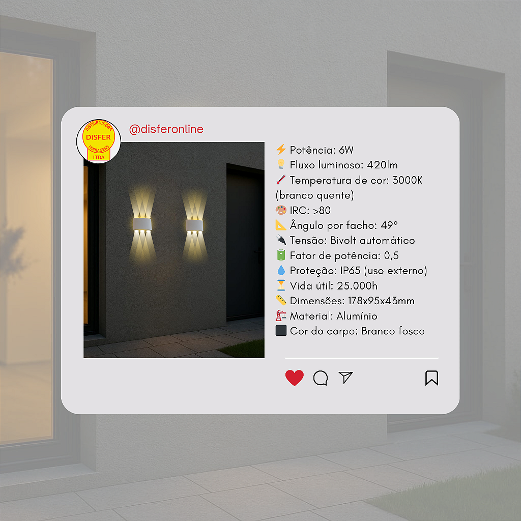 Se a ideia é valorizar fachadas ou paredes externas com efeito de luz diferenciado, a Arandela LED 6 Fachos da Embu LED vai direto ao ponto: são 3 fachos para cima e 3 para baixo, em um jogo de luz cruzado que transforma qualquer muro em uma cena de cinema.