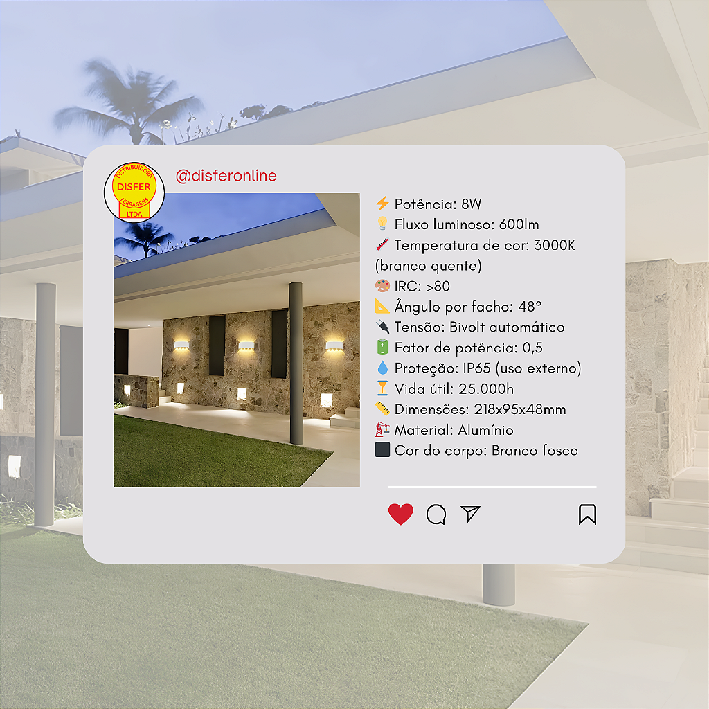 Com luz quente (3000K) e um ângulo de 48° por facho, o desenho luminoso na parede fica marcado, elegante e simétrico — perfeito pra quem quer valorizar detalhes arquitetônicos ou criar um ponto focal à noite.