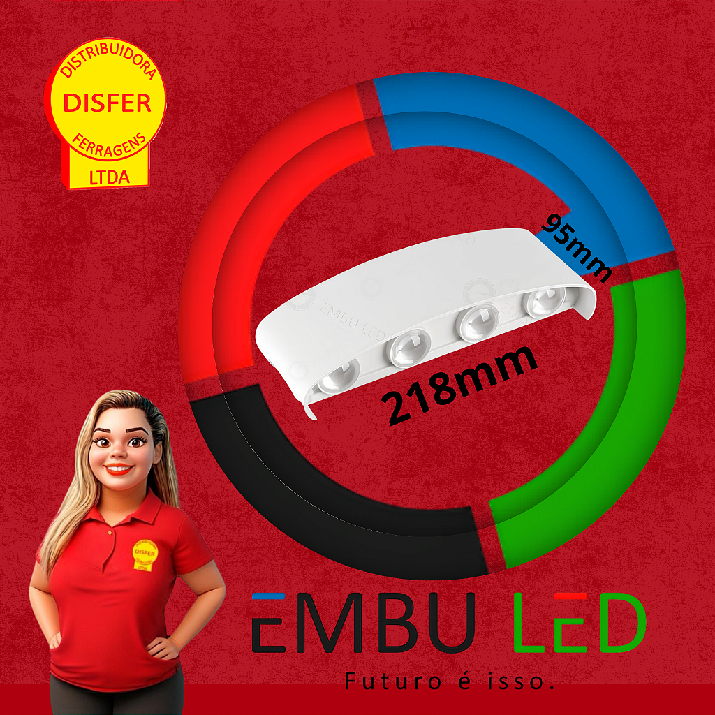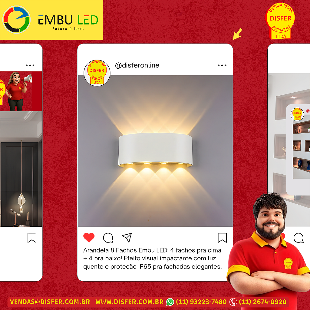 Se a ideia é impressionar de longe, essa aqui entrega tudo: a Arandela 8 Fachos da Embu LED joga 4 fachos pra cima e 4 pra baixo, criando um efeito visual cruzado poderoso que transforma fachadas em verdadeiros murais de luz.