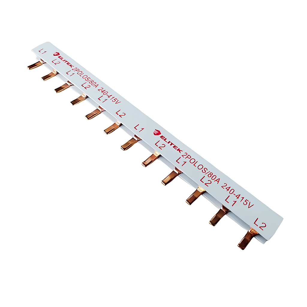 Com capacidade de 80A, o barramento tipo pente da Elitek permite a conexão direta de até 12 disjuntores padrão DIN, otimizando espaço, evitando excesso de fios e agilizando a instalação.