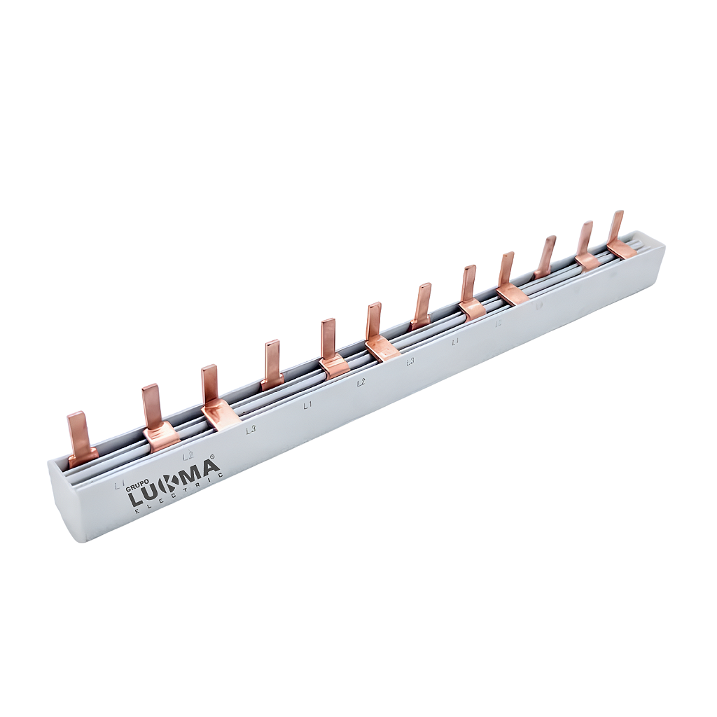 O barramento tipo pente da Lukma permite conectar até 12 disjuntores DIN com distribuição equilibrada entre as três fases, proporcionando uma montagem mais limpa e segura.