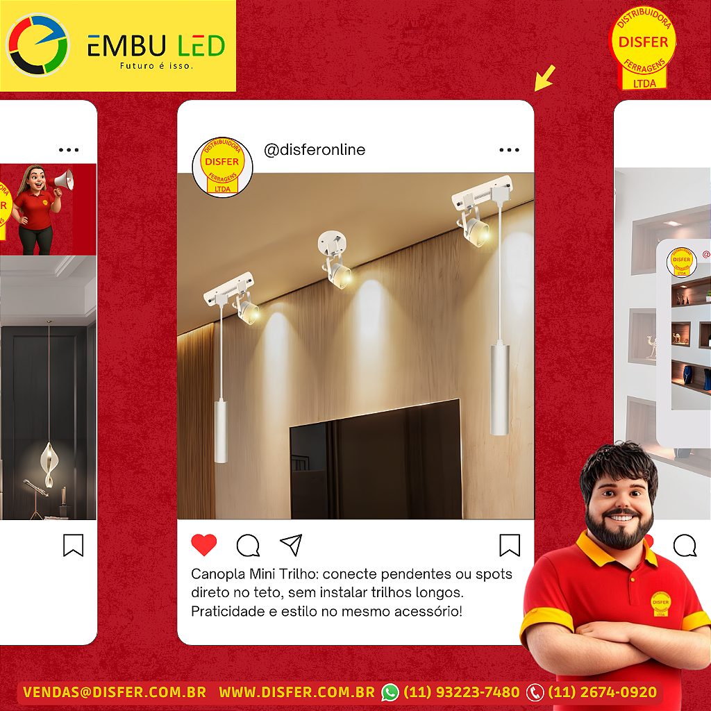 A Canopla Mini Trilho Eletrificado da Embu LED é aquele acessório que resolve o problema sem complicar o projeto. Com apenas 88mm de diâmetro, ela substitui a instalação de trilhos grandes, permitindo conectar spots, pendentes ou luminárias de trilho direto no teto com muito mais praticidade.