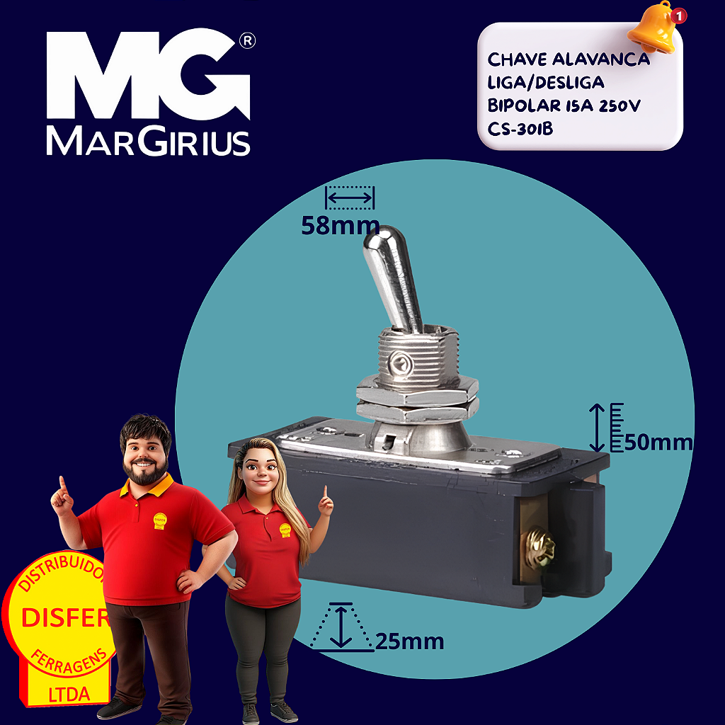 Com a Chave Alavanca Liga/Desliga Bipolar CS-301B, você terá o controle da sua energia de forma segura e eficiente, seja para uso doméstico ou industrial. Margirius, qualidade em cada detalhe!