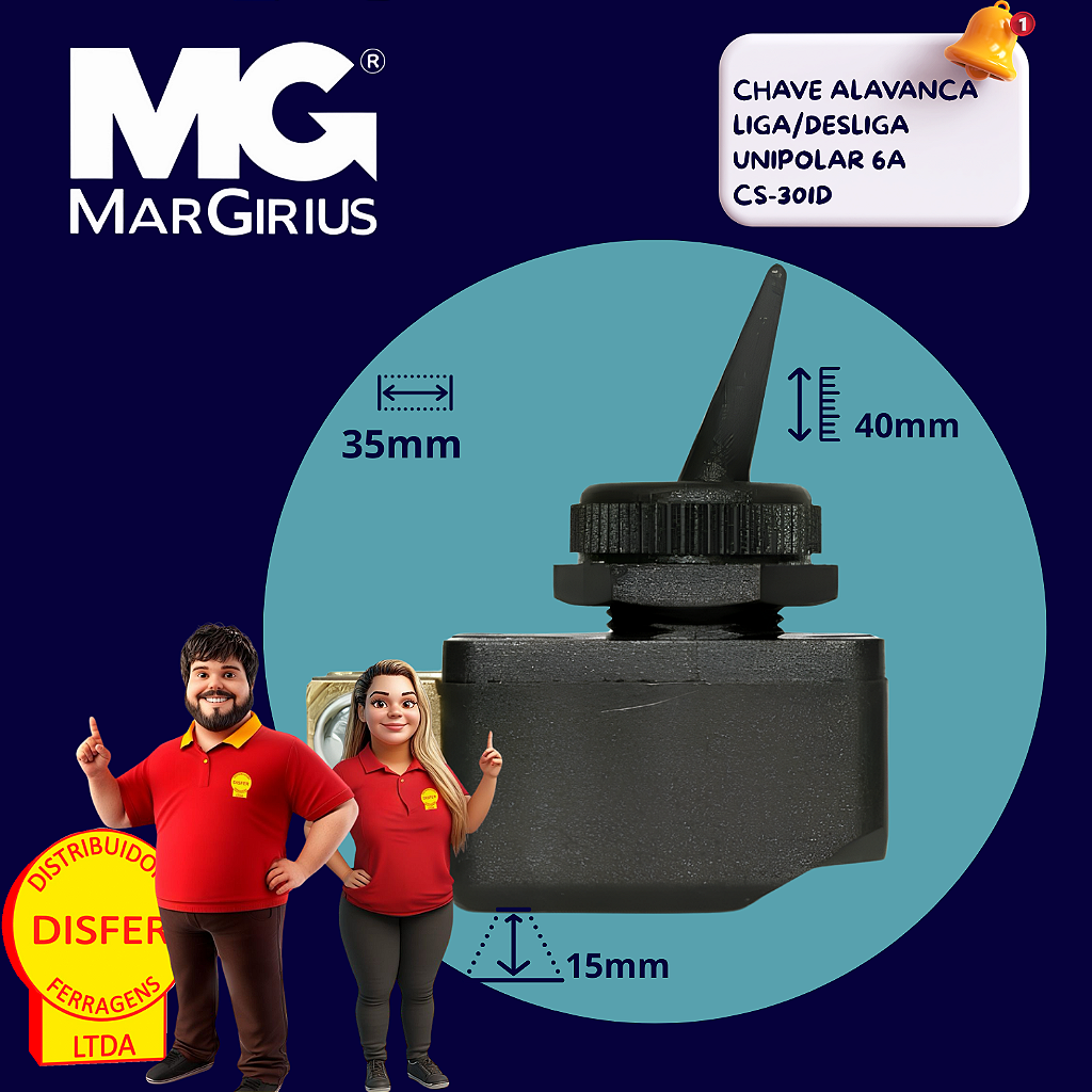 Precisa de uma chave alavanca que faça tudo com simplicidade e segurança? A Chave Alavanca Liga/Desliga CS-301D da Margirius é a opção ideal pra você! Compacta, robusta e super prática, essa chave vai dar aquele toque de confiança nas suas instalações elétricas.