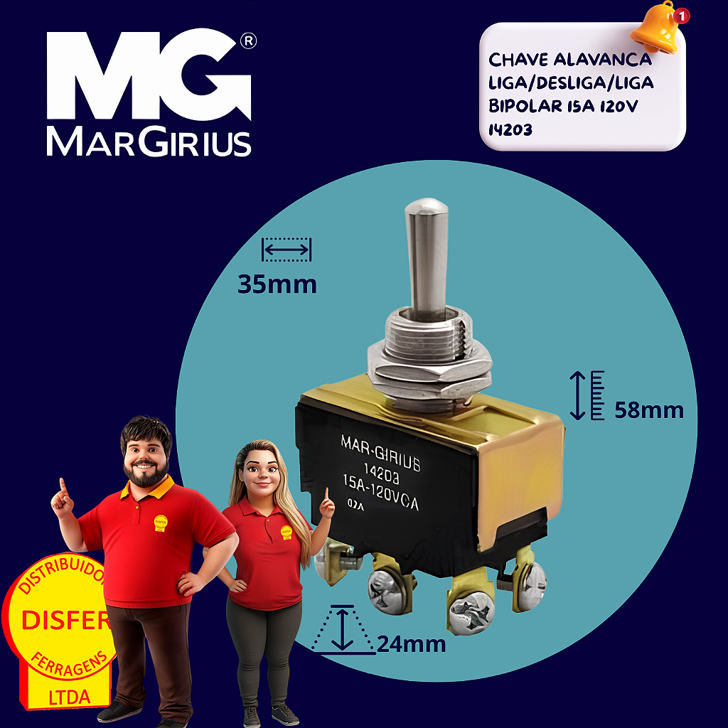 Não perca tempo! Garanta a Chave Alavanca Liga/Desliga/Liga Bipolar 15A 120V Margirius e traga mais eficiência e segurança para seus sistemas elétricos!