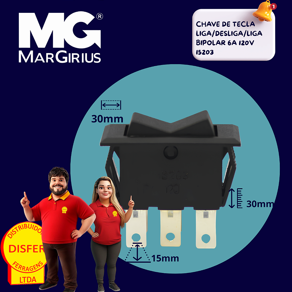 Não perca tempo e escolha a Chave de Tecla Liga/Desliga/Liga Bipolar 15203 da Margirius. Qualidade, segurança e eficiência para seu projeto elétrico!