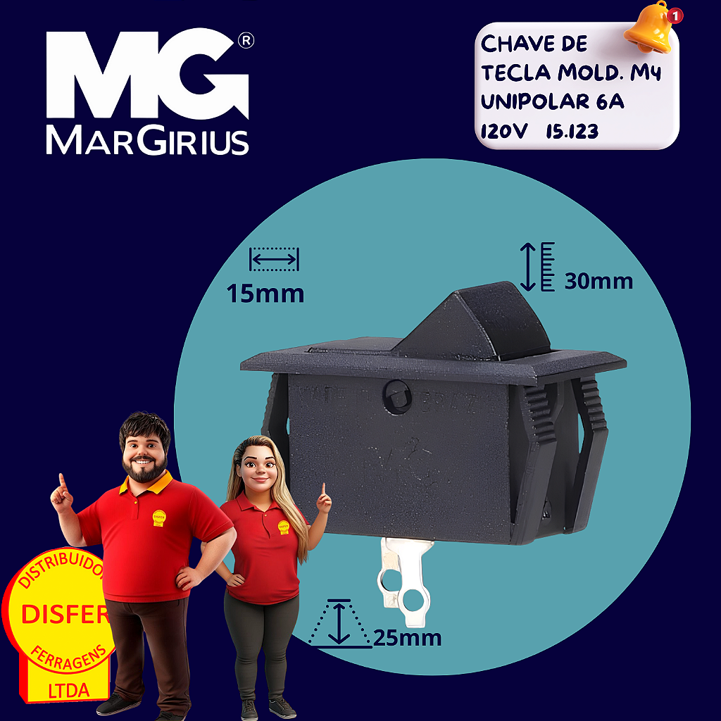 Procurando um interruptor simples, funcional e confiável? Então pode parar a busca por aqui! O Interruptor de Tecla Liga/Desliga 15123 da Margirius entrega tudo isso com a qualidade que a marca já garante há anos.