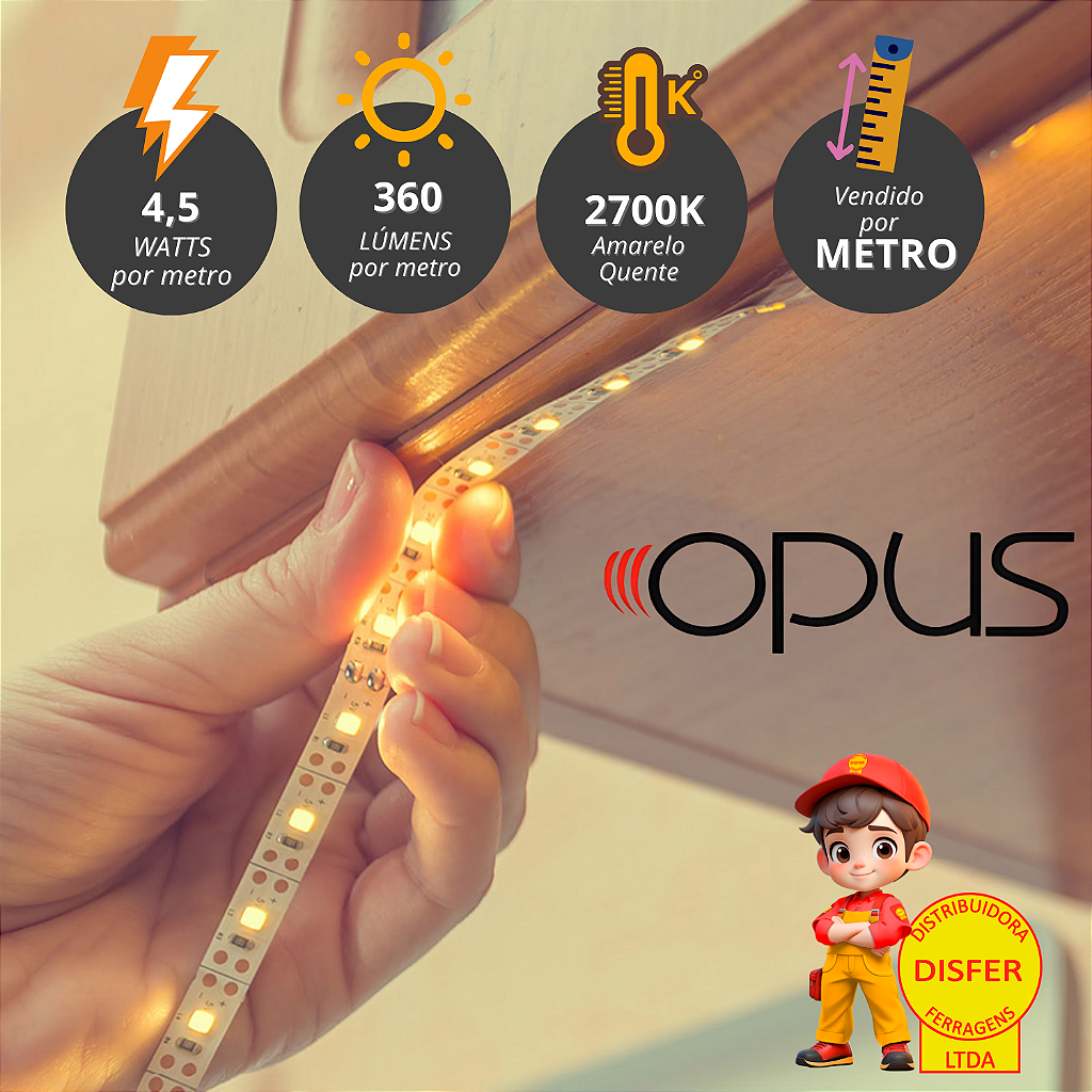 Ilumine seus ambientes com conforto e sofisticação! A Fita LED 2700K da Opus proporciona uma iluminação quente e aconchegante, perfeita para marcenaria, móveis, sancas e decoração de interiores.