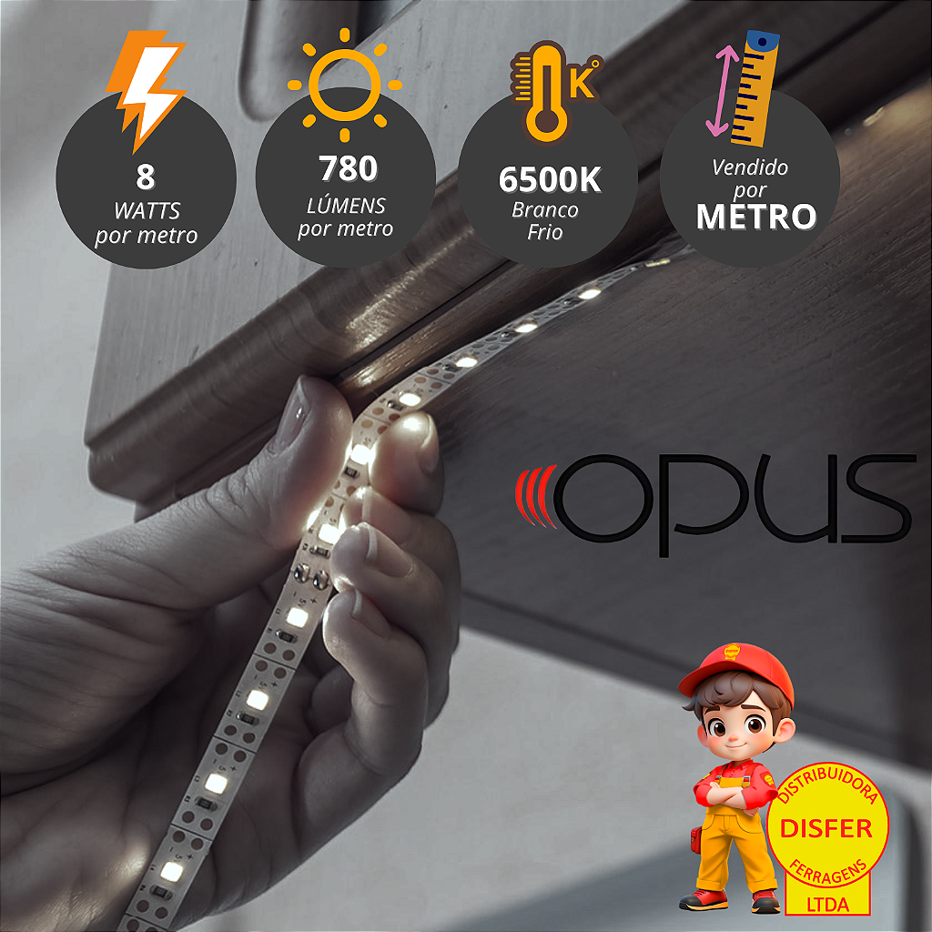 Ilumine seus ambientes com sofisticação! A Fita LED 6500K da Opus proporciona uma iluminação fria e produtiva, perfeita para marcenaria, móveis, sancas e decoração de interiores.