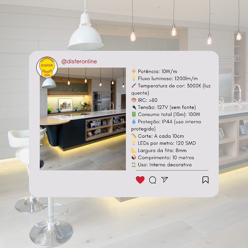 O rolo vem com 10 metros prontos pra instalação, e o melhor: pode ser cortado a cada 10cm, o que permite um encaixe perfeito em qualquer projeto. Funciona direto em 127V, sem fonte externa, e tem proteção IP44, sendo ideal para áreas internas e protegidas.