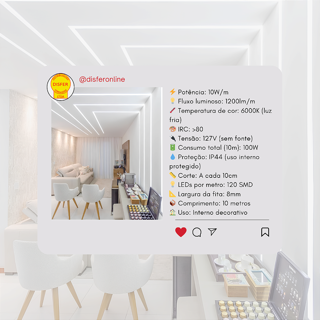 São 120 LEDs por metro, entregando uma luz contínua, uniforme e bem distribuída, sem sombras e falhas. Com 10W/m de potência e 1200lm/m de fluxo luminoso, ela é perfeita para projetos funcionais e esteticamente bem resolvidos. O rolo vem com 10 metros, e pode ser cortado a cada 10cm, garantindo total flexibilidade na instalação.