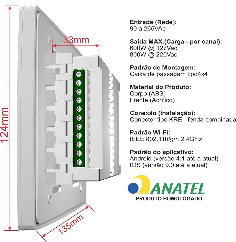 Alimentação: Bivolt automática (de 90 a 260Vac) É necessário o cabo neutro para o interruptor funcionar (neutro x fase ou fase x fase).