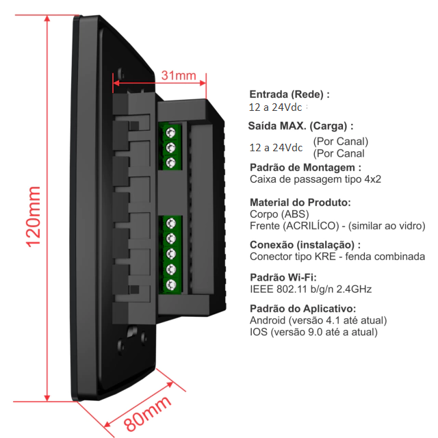 Alimentação: Bivolt automática (de 12 a 24Vdc) É necessário o cabo neutro para o interruptor funcionar (neutro x fase ou fase x fase).