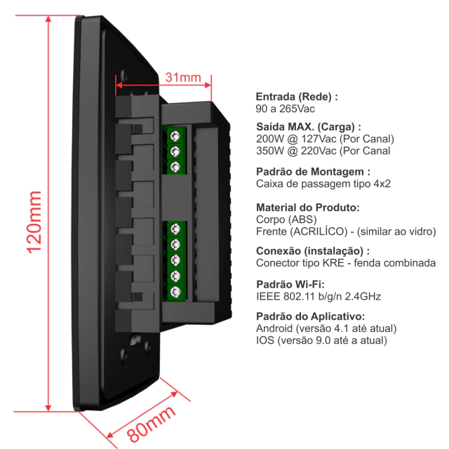 Alimentação: Bivolt automática (de 90 a 260Vac) É necessário o cabo neutro para o interruptor funcionar (neutro x fase ou fase x fase).