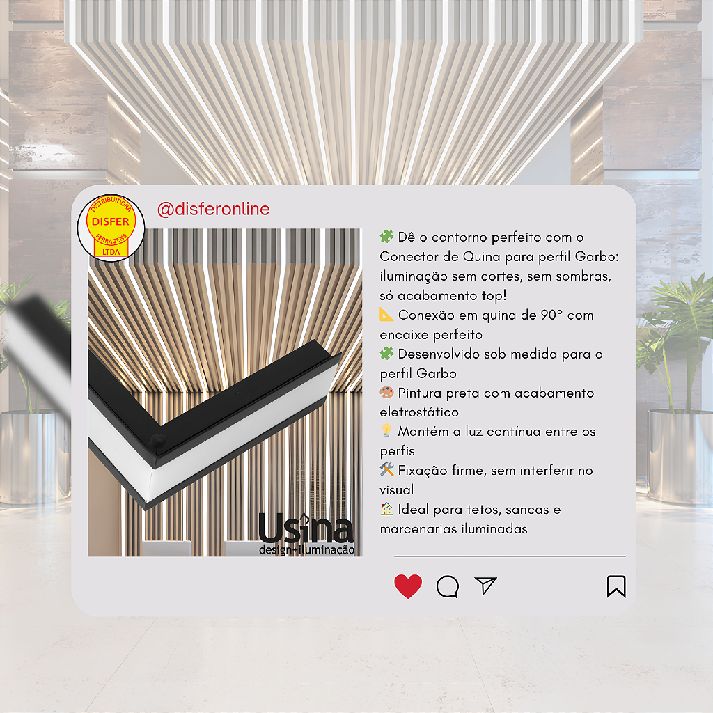 Conector Junção Quina – Perfil Garbo Usina Design: solução de alto padrão para quinas em projetos com perfil Garbo. Mantém o traçado, a luz e o acabamento com máxima precisão.