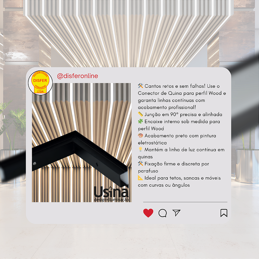 Conector Junção Quina – Perfil Wood Usina Design: essencial para criar projetos com cantos em 90° sem perder o padrão visual. Acabamento limpo, instalação precisa e continuidade total da iluminação linear.