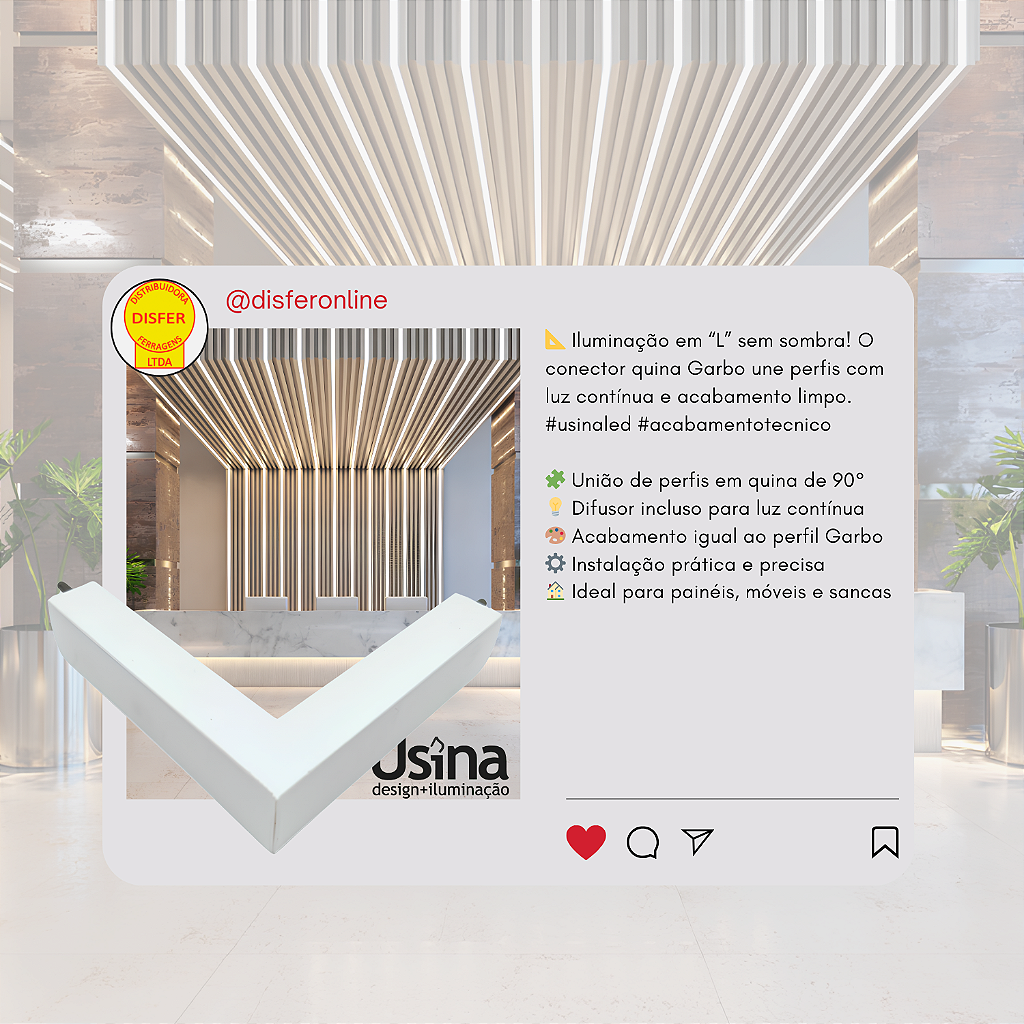 Conector Junção Quina – Perfil de Sobrepor Garbo – Usina Design: ideal para unir perfis em cantos retos com continuidade perfeita de luz e acabamento técnico, direto para projetos de alto padrão.