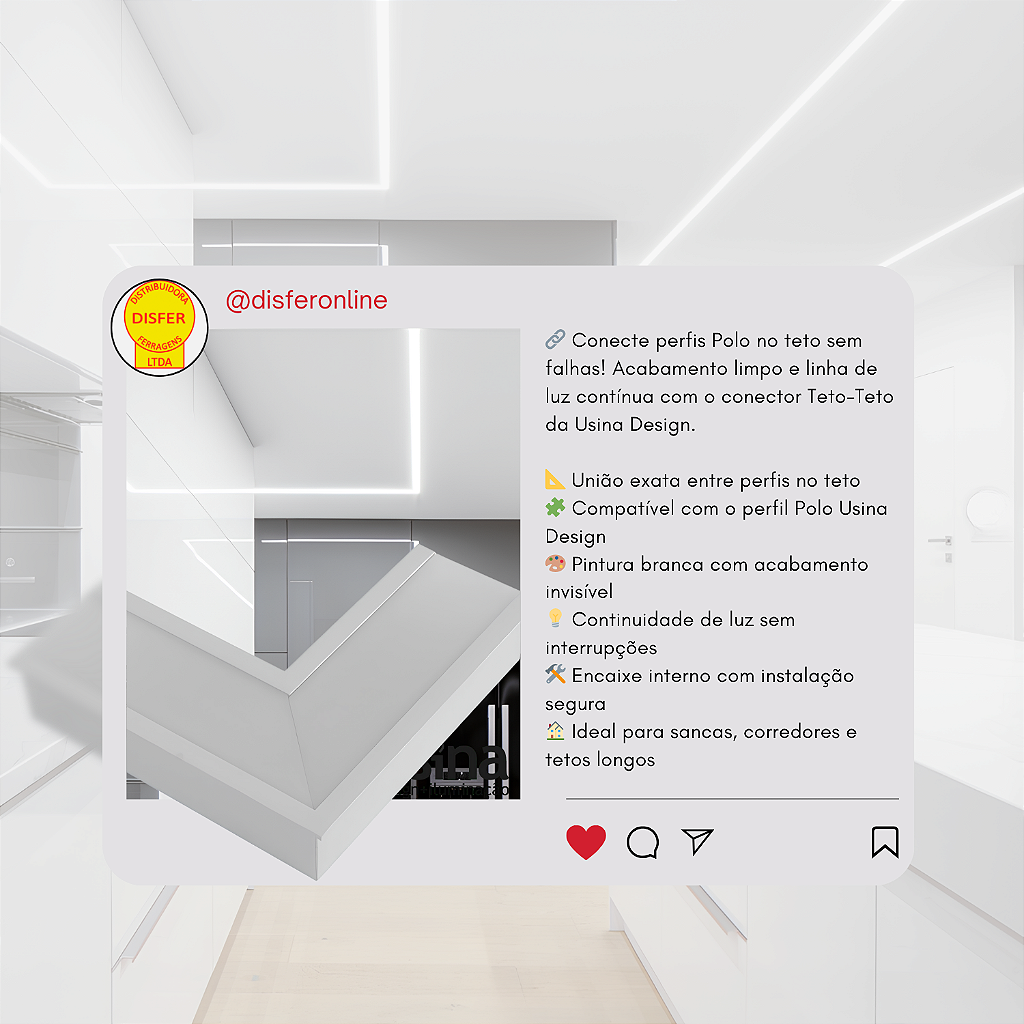 Exemplo prático: Em corredores longos ou salas amplas, o instalador utilizou o conector para duplicar o comprimento do perfil e manter a mesma linha de luz, sem interrupções.