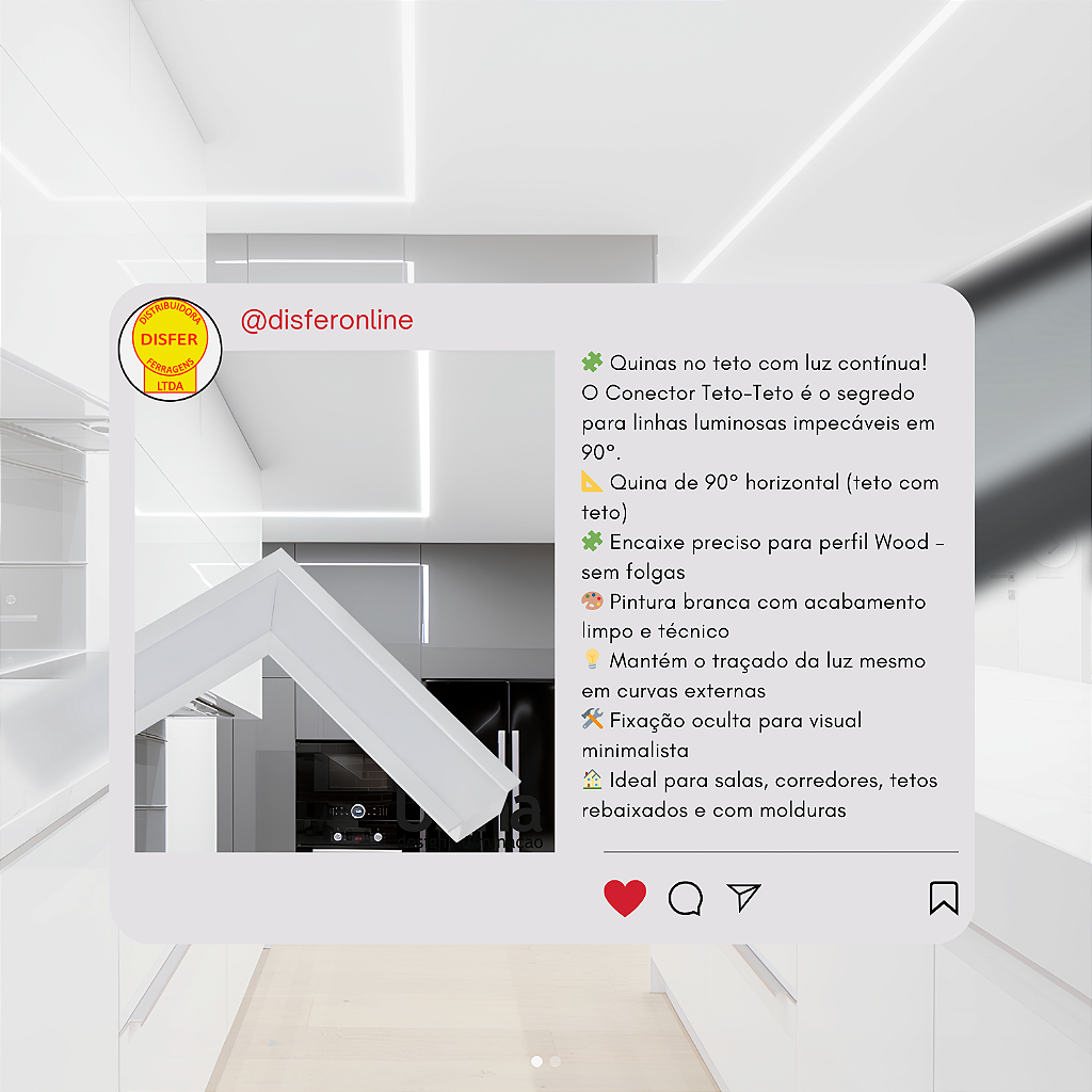 Projetado especificamente para manter o corpo do perfil e o difusor alinhados mesmo em quinas externas, evitando desníveis ou sombras na luz.