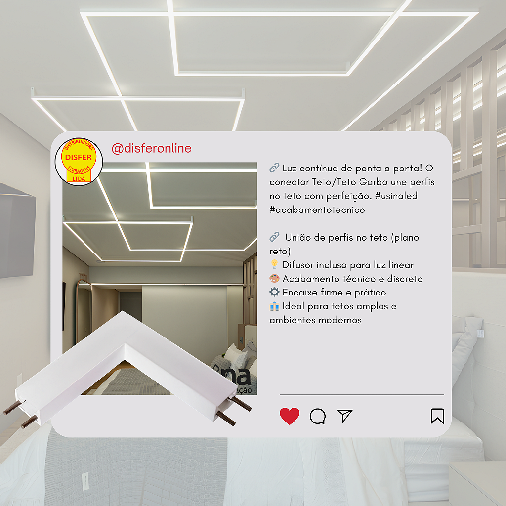Exemplo real: Em lojas de grande porte, o conector foi usado para unir perfis ao longo do forro, destacando corredores com iluminação contínua.