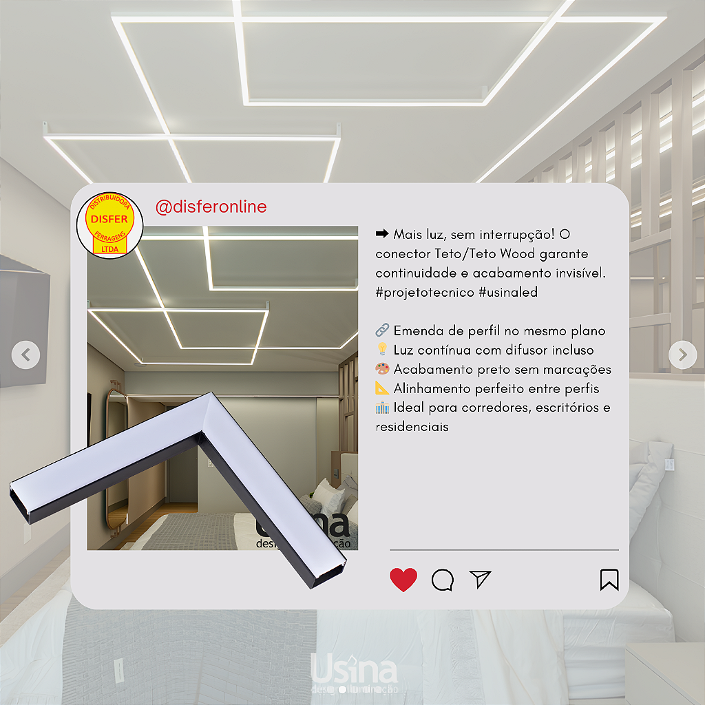 Conector Junção Teto/Teto – Perfil de Sobrepor Wood – Usina Design: a peça certa para estender perfis com perfeição no teto, mantendo a estética, a luz contínua e o acabamento técnico de alto nível.
