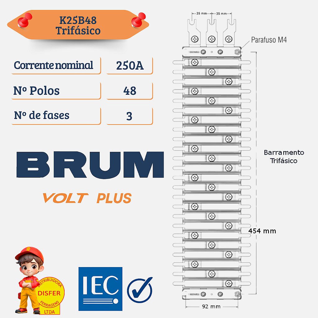 Se você precisa de máxima eficiência e segurança na distribuição elétrica, o Kit Barramento de Cobre Trifásico VOLT PLUS 48 Polos 250A da Brum (K25B48) é a solução ideal! Projetado para quadros elétricos de alta demanda, ele oferece excelente capacidade de condução elétrica e já acompanha barramentos de neutro e terra, além de trilhos DIN, garantindo uma instalação completa e organizada.
