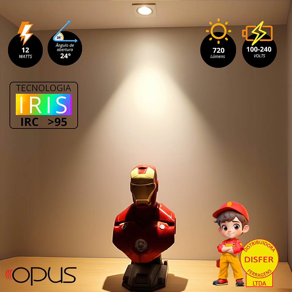 A Lâmpada Dicróica AR111 LED 12W da Opus conta com a inovadora Tecnologia IRIS, proporcionando IRC 95, que garante cores mais vivas e realistas, tornando-a perfeita para lojas, galerias, vitrines e ambientes onde a reprodução fiel das cores é essencial.