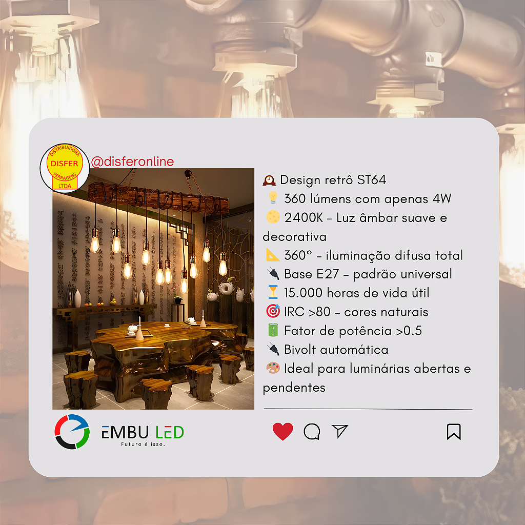 “Combine a ST64 com luminárias abertas, soquetes vintage ou acabamentos em cobre/preto fosco. A luz âmbar valoriza móveis de madeira e paredes rústicas.”