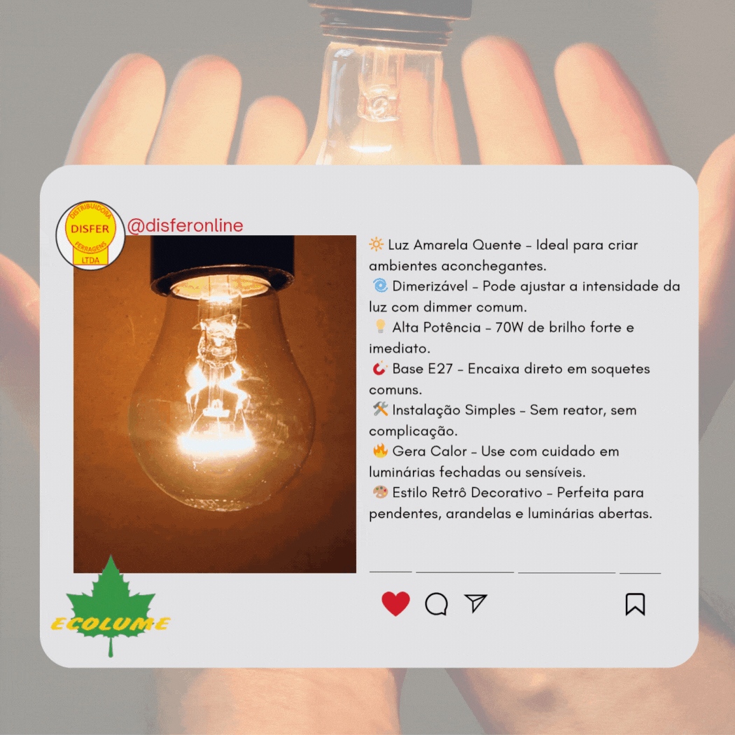 “Essa lâmpada é ideal para ambientes com dimmer, mas atente-se à potência: use dimmers compatíveis com cargas de 70W. Em luminárias fechadas, certifique-se de que haja ventilação para dissipar o calor — isso prolonga a vida útil do filamento.”