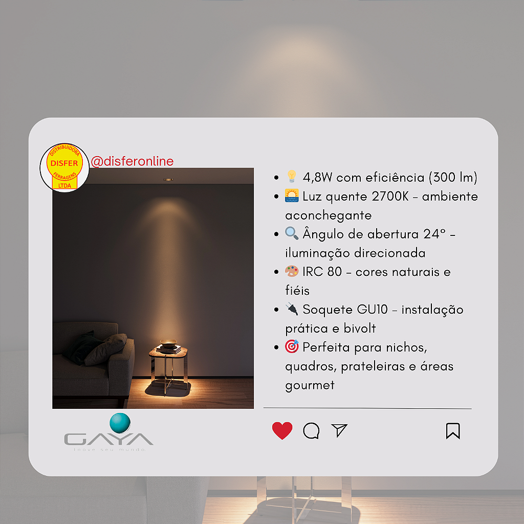 Com ângulo de abertura de 24°, a luz é direcionada para realçar objetos, quadros, móveis ou áreas específicas, enquanto o IRC 80 garante cores mais naturais e fiéis. Substitui lâmpadas halógenas de até 35W, consumindo até 85% menos energia. Bivolt, instalação prática com soquete GU10.