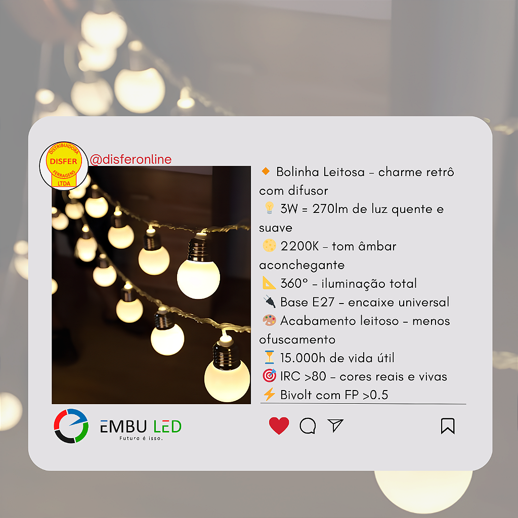 A Lâmpada Bolinha Leitosa 3W da Embuled entrega luz âmbar suave com difusão uniforme, perfeita para quem busca conforto visual e estilo decorativo.