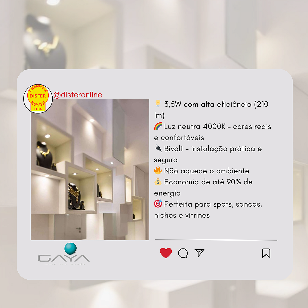 A Lâmpada Mini Dicróica LED MR11 3,5W 4000K da Gaya é ideal para quem busca luz neutra e elegante, perfeita para realçar texturas e cores naturais.