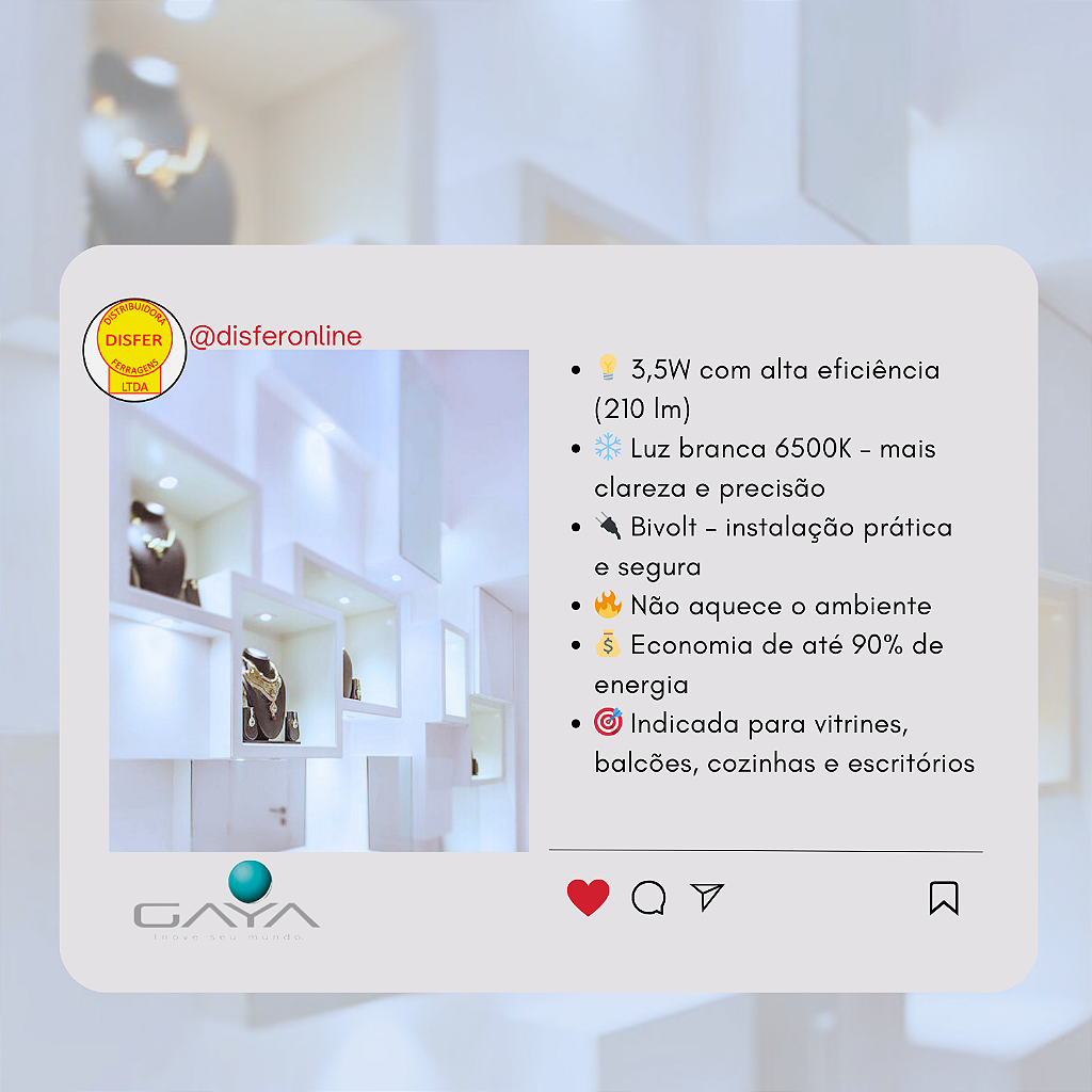 Com apenas 3,5W, oferece 210 lúmens de luminosidade eficiente e garante economia de até 90% de energia em relação às lâmpadas halógenas tradicionais. Compacta, bivolt e de fácil instalação, é perfeita para quem busca iluminação profissional com baixo consumo.