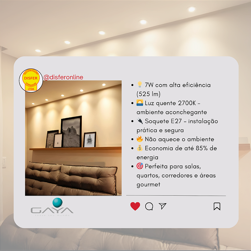 “A luz quente 2700K cria um clima aconchegante e intimista, perfeita para salas, quartos e áreas gourmet.”