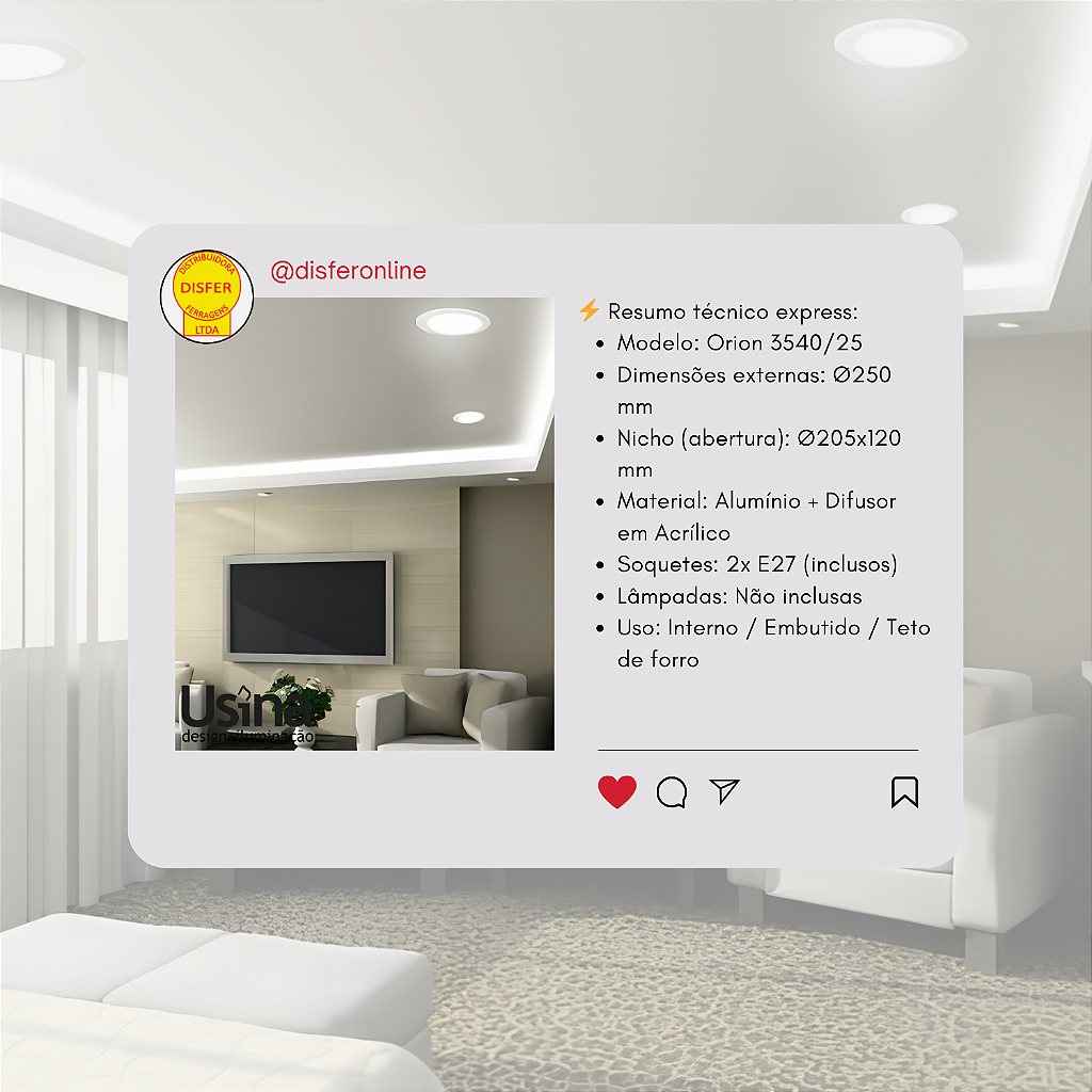 Instalada embutida no forro, a Orion 3540/25 fica rente ao teto, trazendo elegância sem excesso de volume visual. O formato circular harmoniza com espaços variados, de residenciais a comerciais.