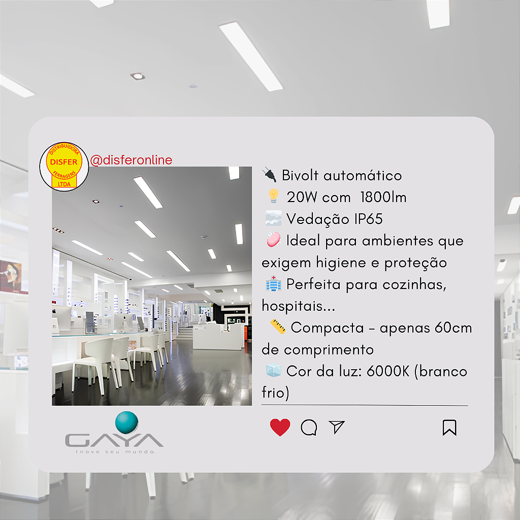 A Luminária Hermética LED 20W da Gaya foi desenvolvida para oferecer iluminação intensa, econômica e resistente em ambientes que demandam maior proteção contra poeira, umidade e respingos. Com estrutura em PC (policarbonato) e grau de proteção IP65, ela impede a entrada de partículas e água, tornando-se a escolha ideal para cozinhas industriais, hospitais, frigoríficos, laboratórios, estacionamentos cobertos, corredores externos, áreas técnicas e depósitos.