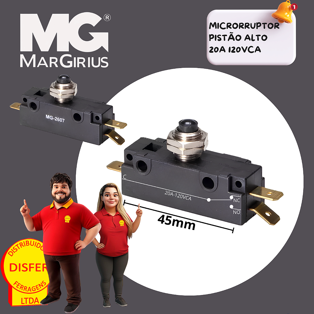 Se você procura um componente pequeno no tamanho, mas gigante na eficiência, o Microrruptor MG-2607 com pistão alto da Margirius é a pedida certa! Ideal pra acionamentos precisos e confiáveis em máquinas, sistemas automatizados e muito mais.