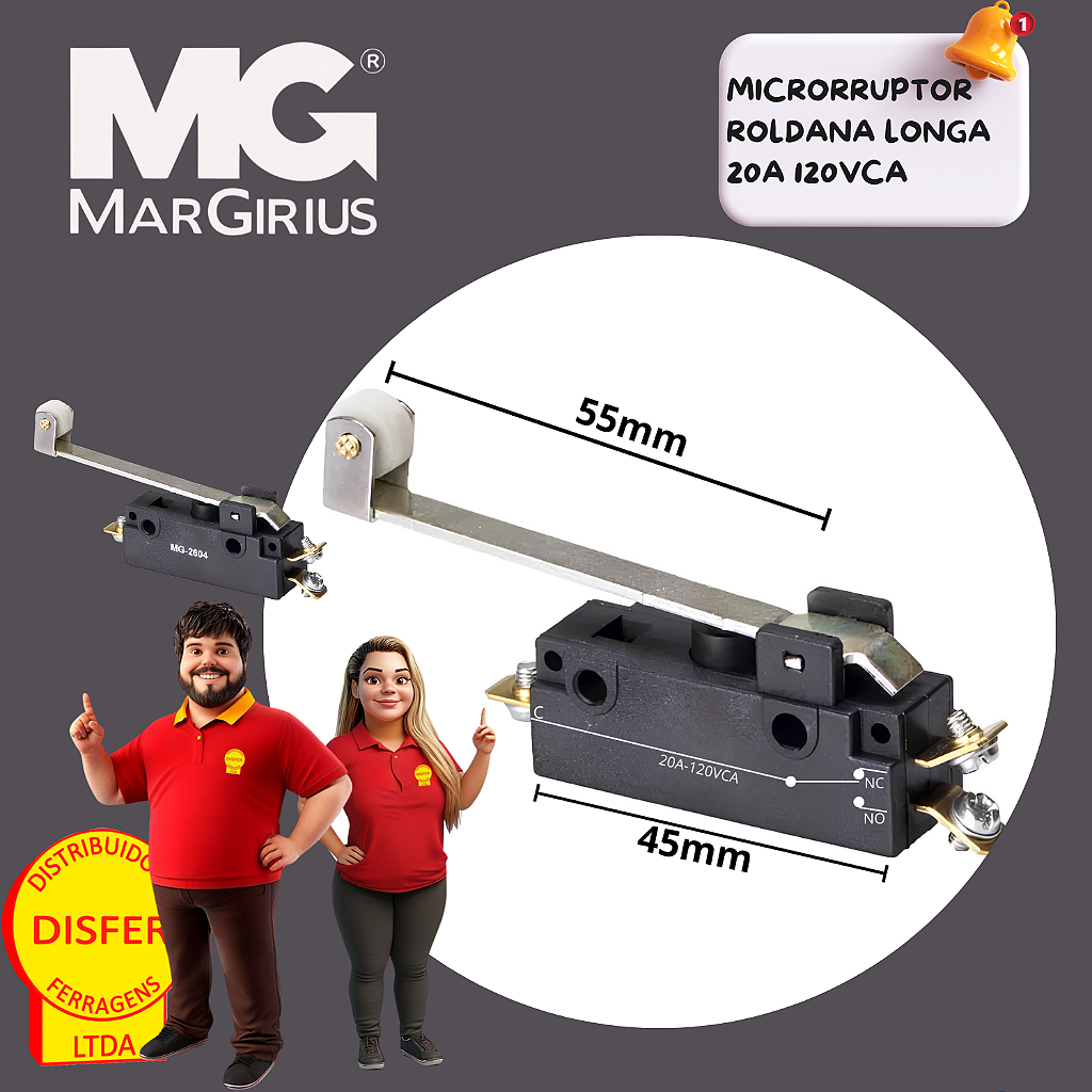 Se o seu projeto precisa de um interruptor que detecta até o menor deslocamento com firmeza e segurança, o MG-2604 da Margirius é a escolha certa! Compacto, forte e com roldana longa, ele é ideal pra aplicações que exigem maior alcance no acionamento.