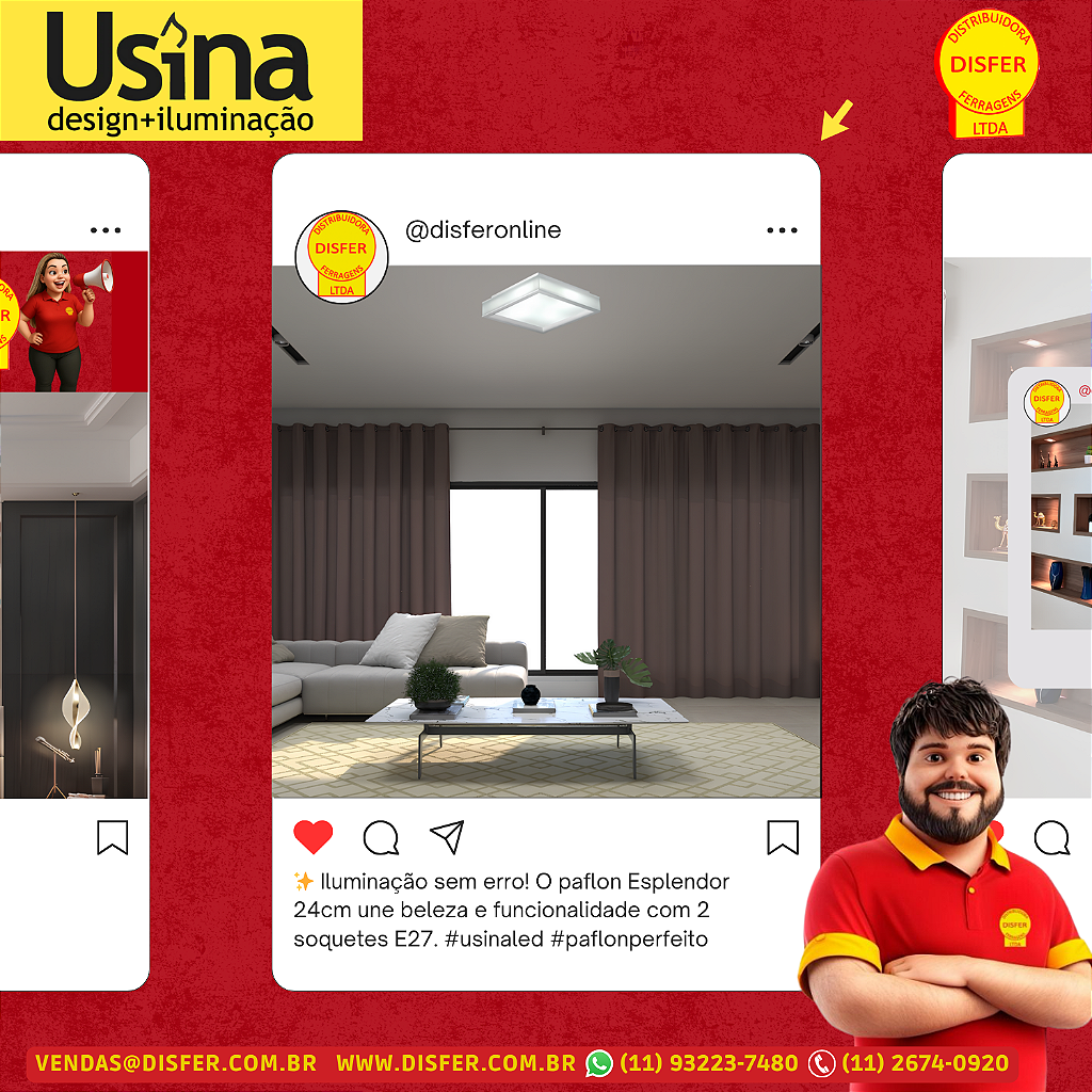 Paflon Quadrado Esplendor 24cm – Usina Design: iluminação discreta, eficiente e com estilo para qualquer ambiente. Prático, bonito e durável.