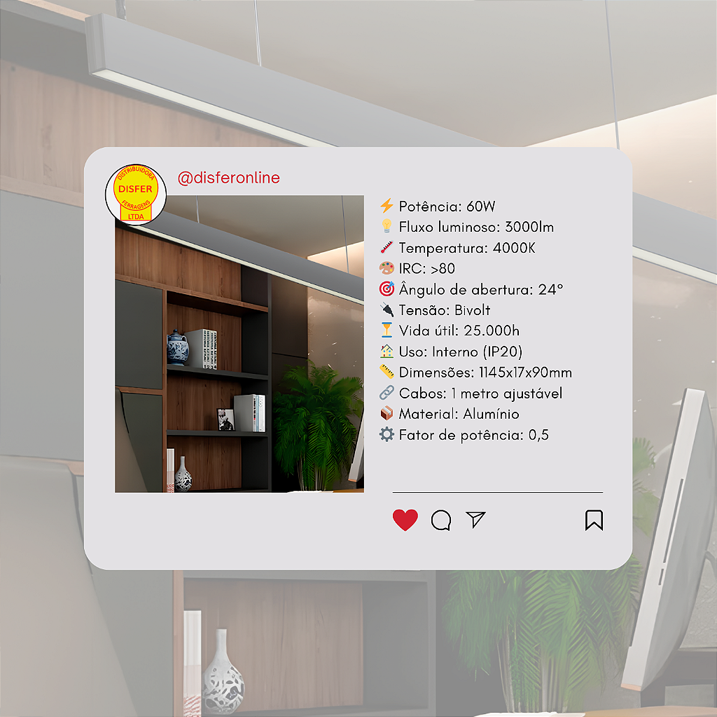 São 60W de potência e 3000 lúmens, com foco concentrado de 24° — ideal para quem precisa destacar áreas específicas com luz intensa e controle visual, como em bancadas de atendimento, galerias, mesas de reunião ou ambientes corporativos.