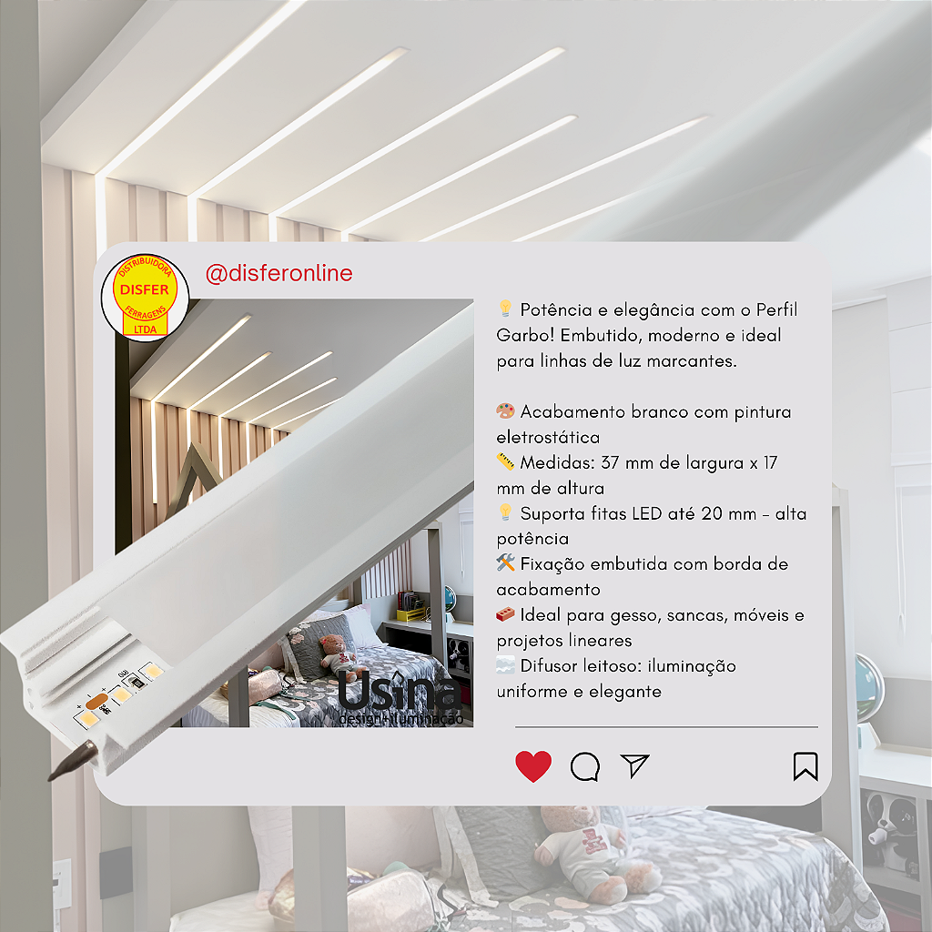 Perfil Garbo 37×17 – Usina Design: versátil, elegante e funcional. Perfeito para quem busca um perfil embutido com presença e iluminação de alto desempenho. Ideal para valorizar ambientes com linhas de luz bem marcadas e acabamento de primeira.