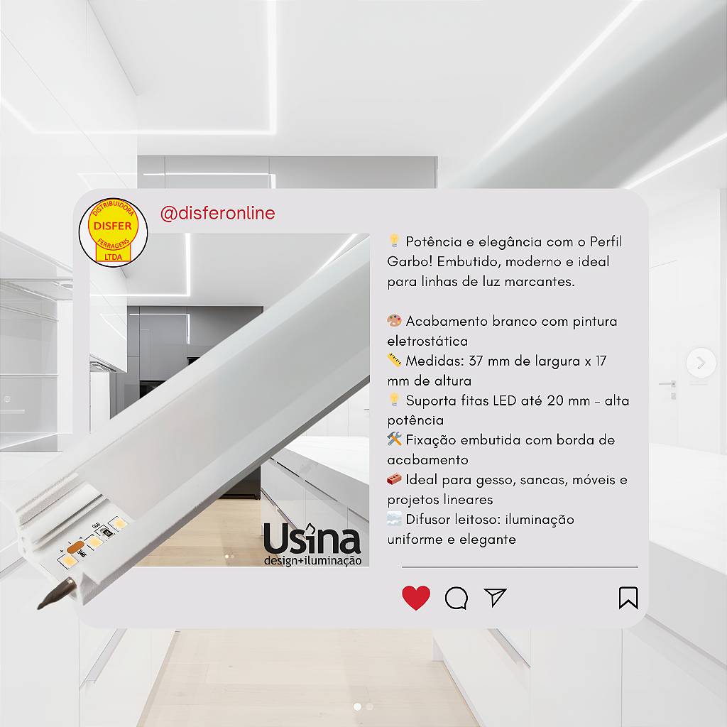 Perfil Garbo 37×17 – Usina Design: versátil, elegante e funcional. Perfeito para quem busca um perfil embutido com presença e iluminação de alto desempenho. Ideal para valorizar ambientes com linhas de luz bem marcadas e acabamento de primeira.