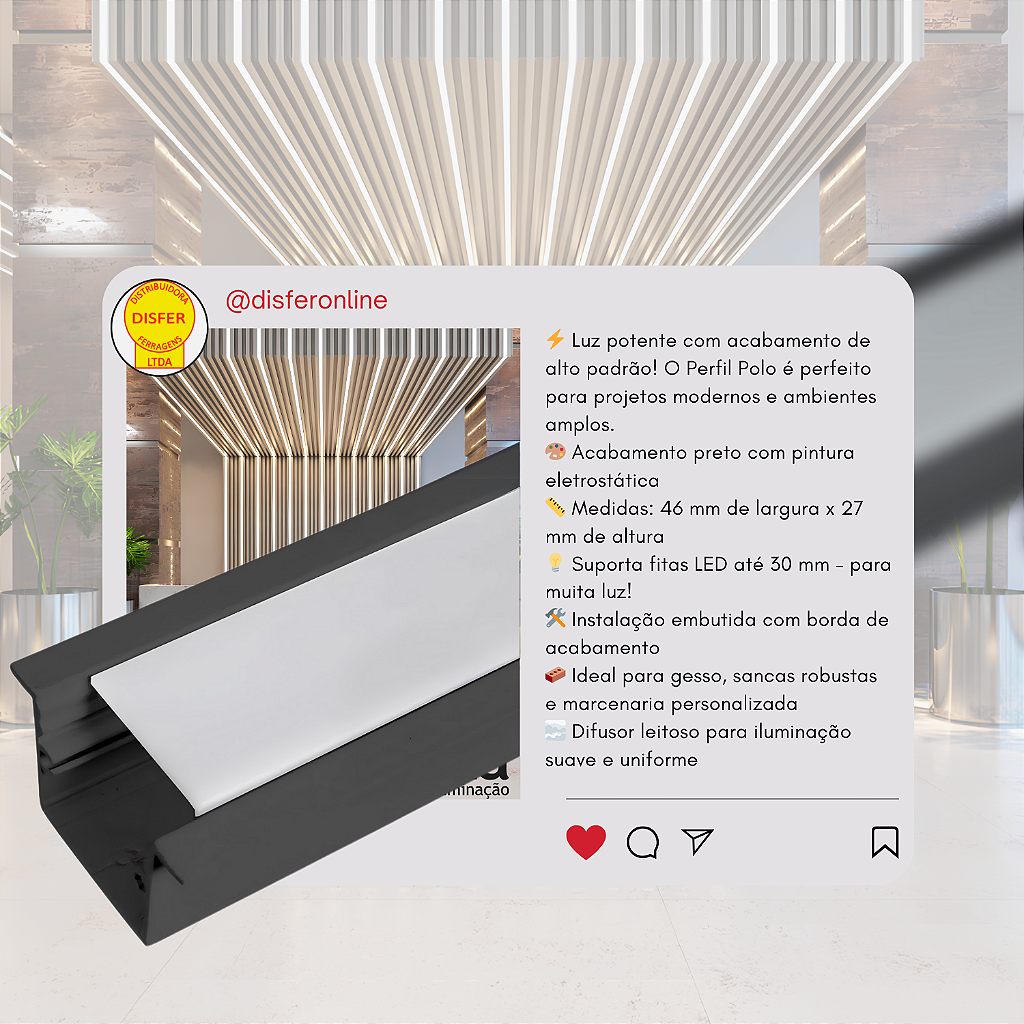Perfil Polo 46×27 – Usina Design: quando o projeto exige mais luz e mais presença, o Polo entrega. Ideal para linhas contínuas, visuais modernos e aplicações que unem estética e eficiência.