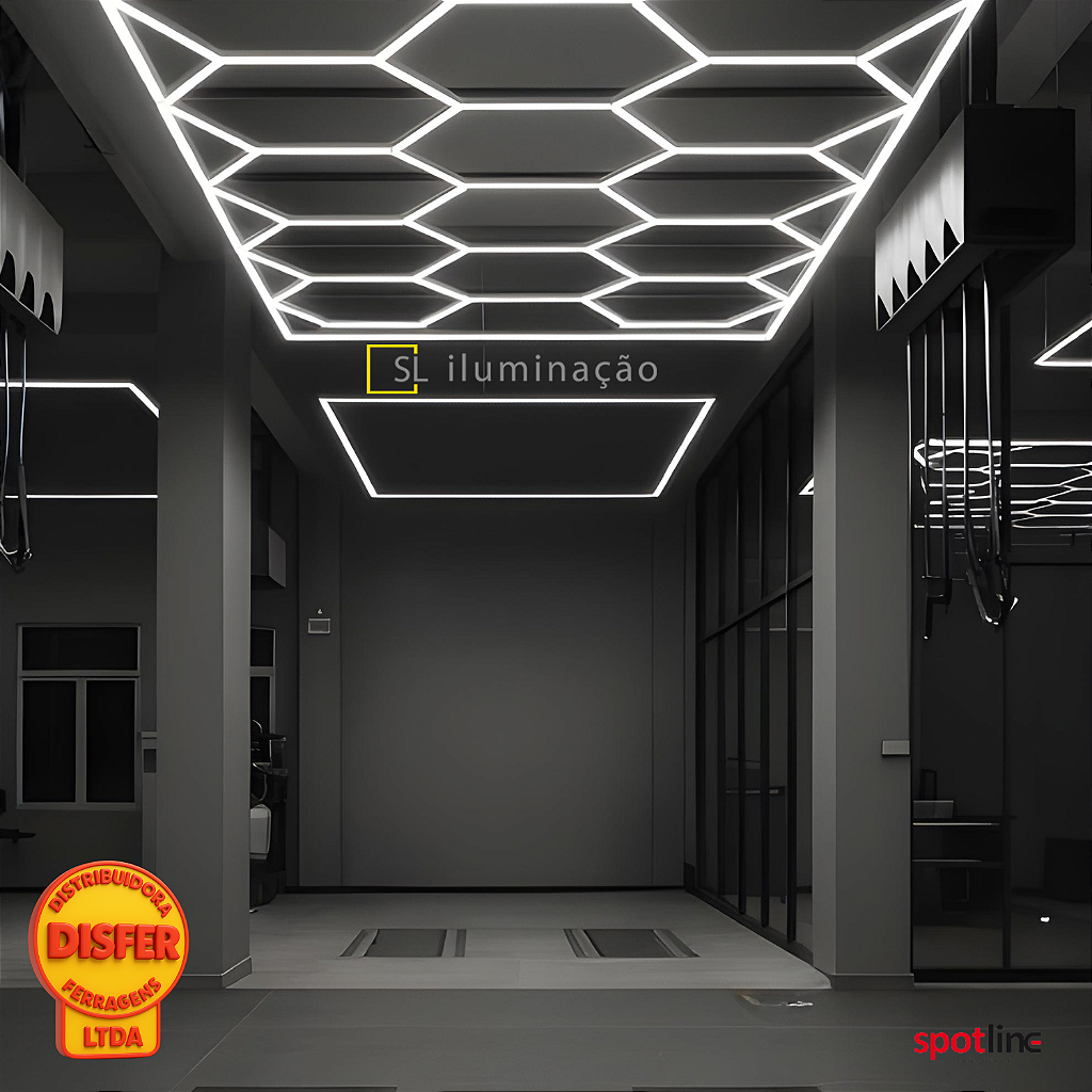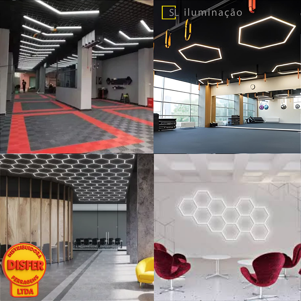colmeias hexagonais, molduras, caminhos luminosos, padrões industriais, composições artísticas e setups para academias, oficinas, bares, hotéis e muito mais.