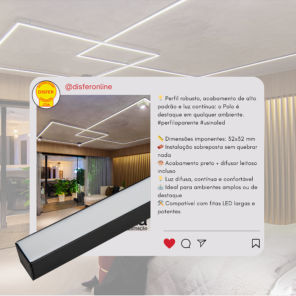 Perfil de Sobrepor Polo 32×32 – Usina Design: ideal para projetos que pedem um perfil aparente, robusto e com acabamento premium. Luz e estrutura que não passam despercebidos.